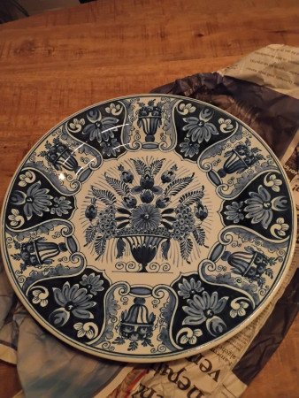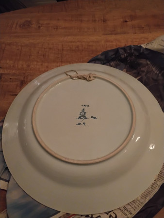 Deze is gemaakt bij potterie Oud Delft uit Nijmegen. Dit bord staat in de catalogus van 1935 onder het nummer 433Z zoals op uw bord staat. Echter 33 cm en niet 34 cm. Het bord werd in 1 formaten aangeboden gaande van 14 cm (414Z) tot 50 cm 450Z. Het cijfer na de vier slaat dus op het formaat. Het is handgeschilderd en te dateren tussen 1935 en 1963 ongeveer. Er werd geen lijst bijgehouden van de schilders. Slechts enkelen zijn bekend doch deze op uw bord helaas niet. Waarschijnlijk is uw bord geschilderd door twee schilders, n.l. iemand die de rand schilderde en de andere het middenvlak wat trouwens niet ongebruikelijk was. Er waren ook thuisschilders en schilders die ook voor andere fabrieken schilderden zoals Plazuid, Jumbo enz... CC kan mogelijks staan voor Cornelia Cabout ( geboren 1904) die voor Plazuid schilderde tot 1928 en mogelijks daarna voor oud delft. DR mij helaas niet bekend.