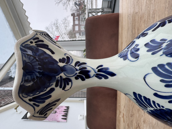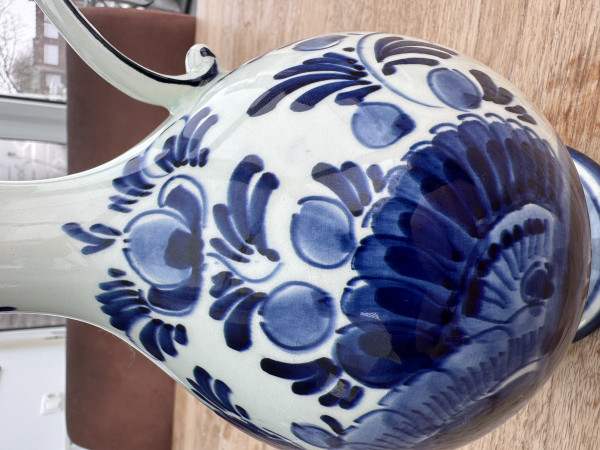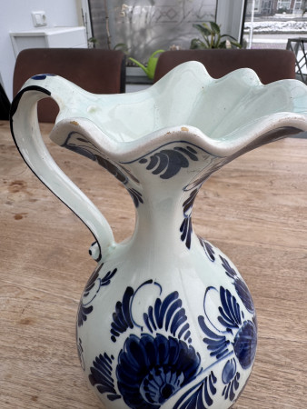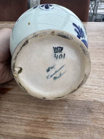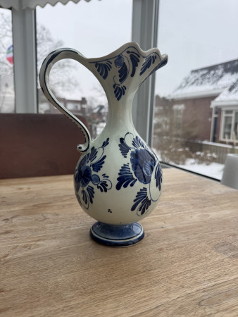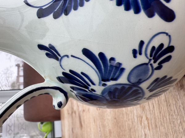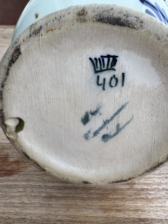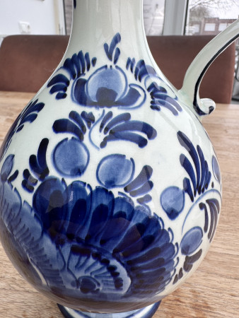 Ik denk dat het een handgeschilderde karaf betreft. Het porselein is wat gelig van kleur en ik denk de chips op de bovenste rand te zien. Verder heeft het een geschreven merk onderop.