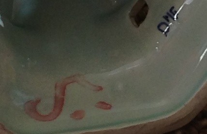 Dit molentje is niet van Delfts blauw, maar gemaakt door een plateelfabriek buiten de stad Delft. Het merk DMF is onbekend. Het decor is wel met de hand geschilderd. Waarschijnlijk is dit molentje voor de toeristenmarkt gemaakt.
