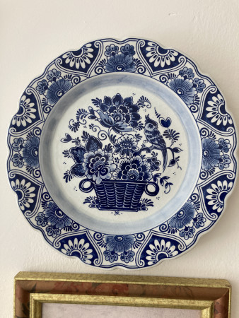 Royal blue basket with flowers and a bird and a pattern around the edges. On the back it states Delft Blue, Handpainted, Made in Holland, JZ