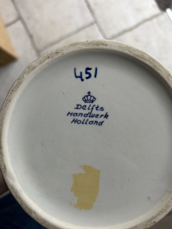 Helaas geen authentiek Delft. Deze zijn gemaakt bij plateelbakkerij Flora uit Gouda. 1970 - 1980. Decornummer 451 mvg Franky