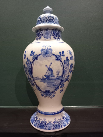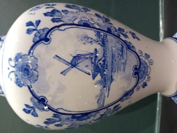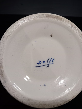 Helaas geen Delft. Gemaakt in Maastricht omstreeks 1960. Maakte deel uit van een kaststel zoals hieronder.
