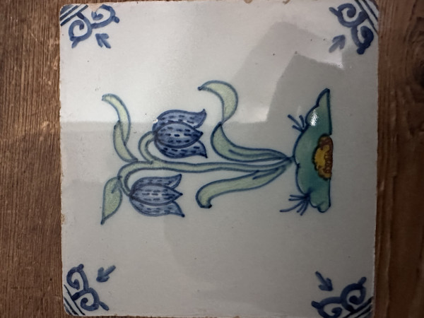tegel met kievitsbloem blauw/groen en geel gedecoreerd