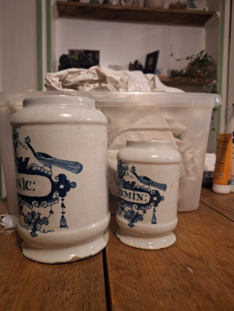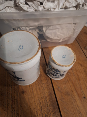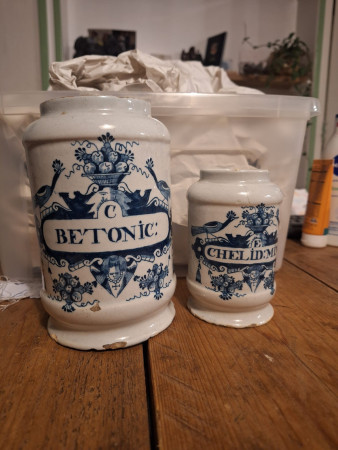Twee apothekerspoten in blauw wit. Gemerkt voor de Lampetkan