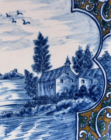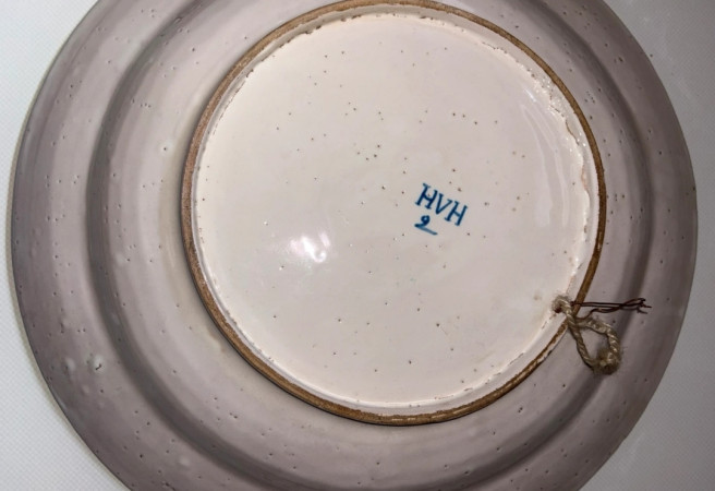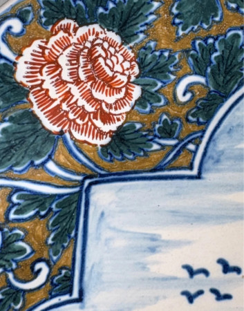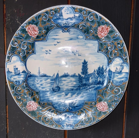 U uneda Bord 1 Voorwerp Merk Materiaal Decoratie Handgeschilderd bord met gekleurde details op de rand en blauw wit landschap in het midden Afmetingen 35Ø Collectie publiekscollectie