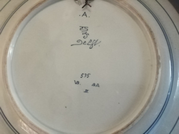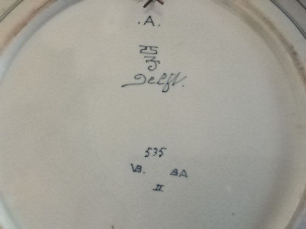 This plate was made by the Porceleyne Fles from Delft, the only Delft factory still active today. Painted in 1931 by W. van Baarsel, who painted there from 1893 to 1945. The A means that this was a less successful design that was sold a bit cheaper.