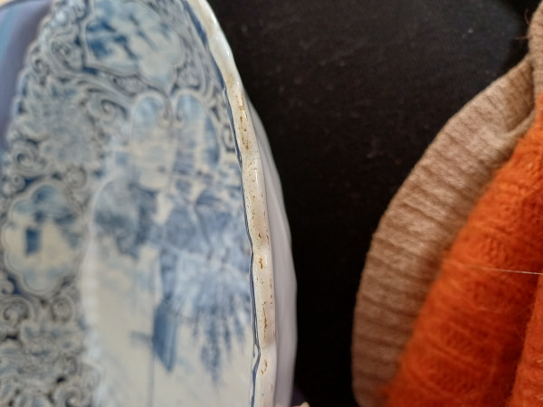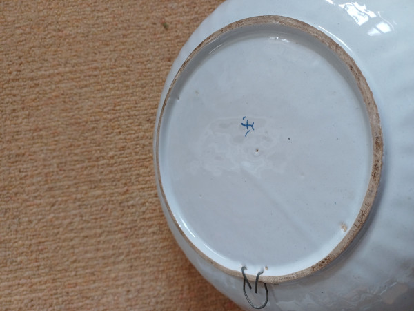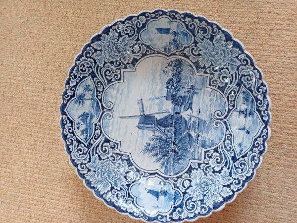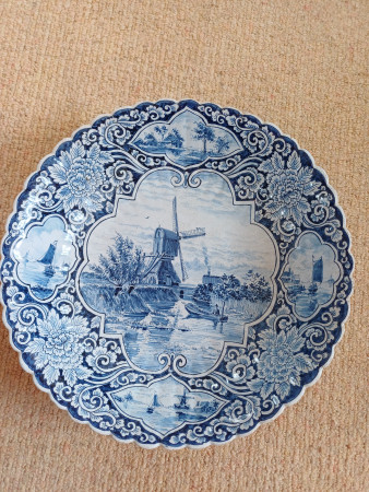 Designed & painted after Roelofs with centre cartouche of old Dutch windmill by a pond, with oriental style fisherman in rowing boat & a building with smoking chimney in distance. Surrounded by foliate and floral border containing four different smaller cartouche scenes of boats, water scenes and dwellings. Artist signed. Yellow clay shows where worn. Pooling and pitting to glaze. Foot pieced for old wire hanging loop.