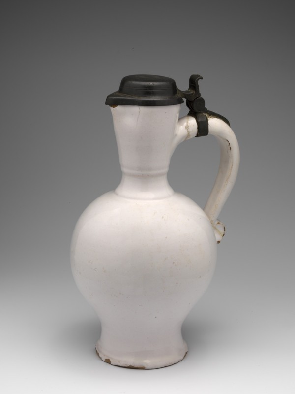 object Bolvormige schenkkan, hoge versmalde onderzijde, ingenoerde hals, naar boven toe wijder uitlopend met sneb. Staand oor waaraan tinnen deksel is vastgezet. Wit.