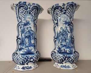 Dit is geen Delfts aardewerk. Het lijkt me "pate tendre " met andere woorden "zacht porselein " begin XXste eeuw, origine onbekend.