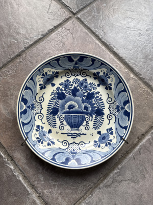 Dit lijkt mij een Delfts blauw schotelbord te zijn, waarschijnlijk daterend uit de tweede helft van de 18e eeuw of het begin van de 19e eeuw.