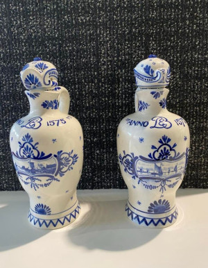 Beide gemaakt bij de porceleyne fles uit Delft. De linkse  is uit 1968 en geschilderd door mevr. H.v.d. Dool die er schilderde van 1964 tot 1975.