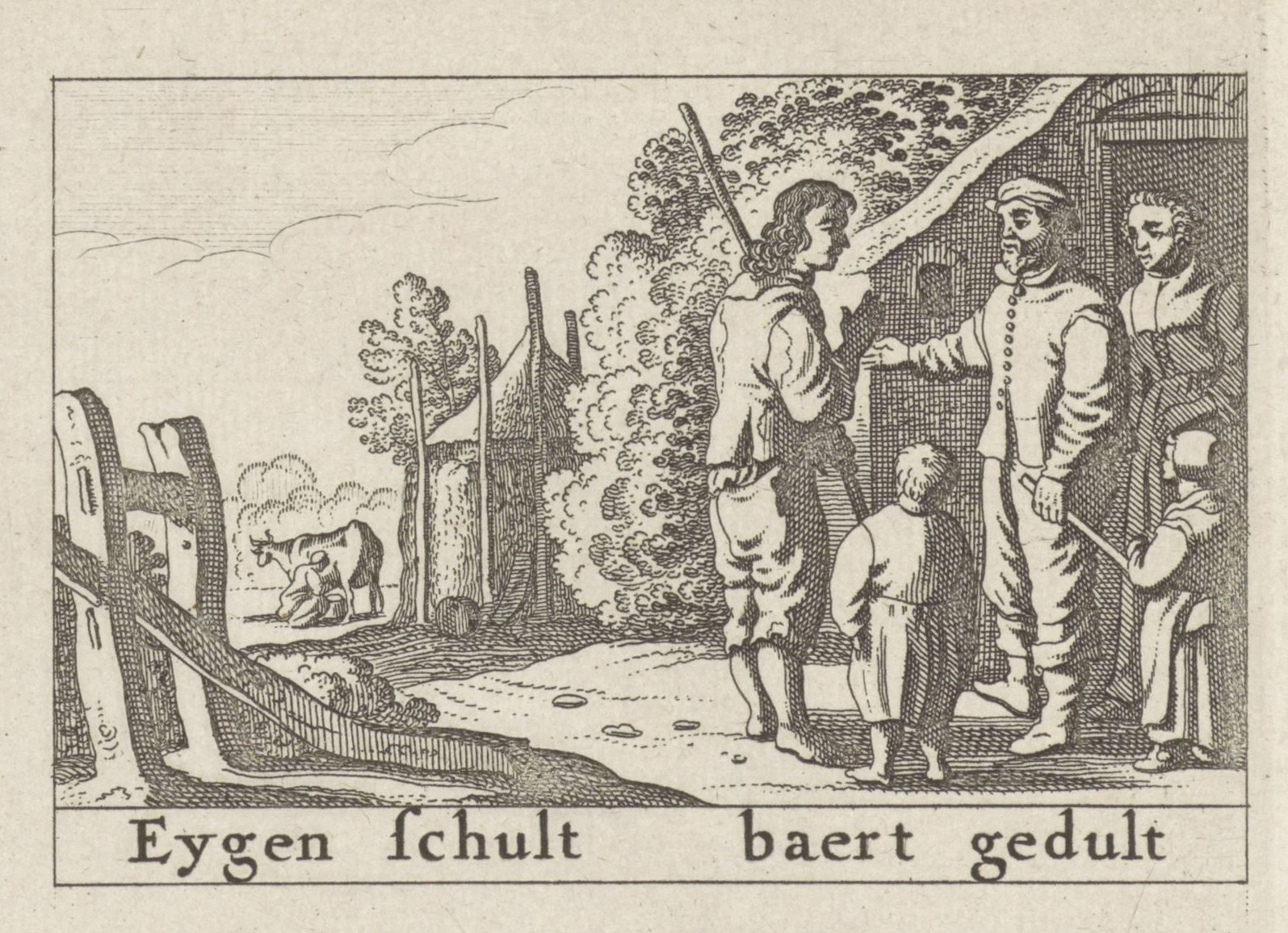 In een prent van Claes Jansz. Visscher II komt dit moment voor als onderdeel van een reeks, die bekend is onder de titel Geschiedenis van de verloren zoon. Boven het bijschrift Eygen schult baert gedult is te zien waarop ‘De verloren zoon’ – inmiddels berooid – richting zijn nieuwe taak wordt gezonden. (zie bijgevoegde afbeelding) Hij heeft een lange stok bij zich, die zijn rondtrekkend of dolend bestaan lijkt te onderstrepen. In het fragment dat volgt in de reeks bevindt hij zich al tussen de varkens.
