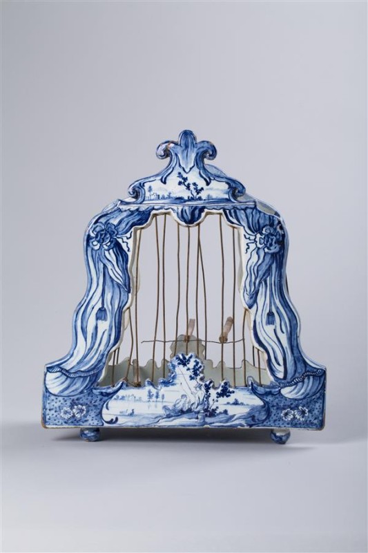 Meerdere vogelkooien zijn bekend met een in blauw en polychroom uitgevoerde versiering, waarvan geen enkel exemplaar is gemerkt. Gelijksoortige trompe-l'oeil beschilderingen van al dan niet met draperieën en kwasten uitgevoerde kooien treffen we ook aan op plaques, waarbij zelfs exemplaren met een baldakijn of tuinvazen zijn uitgedost.
