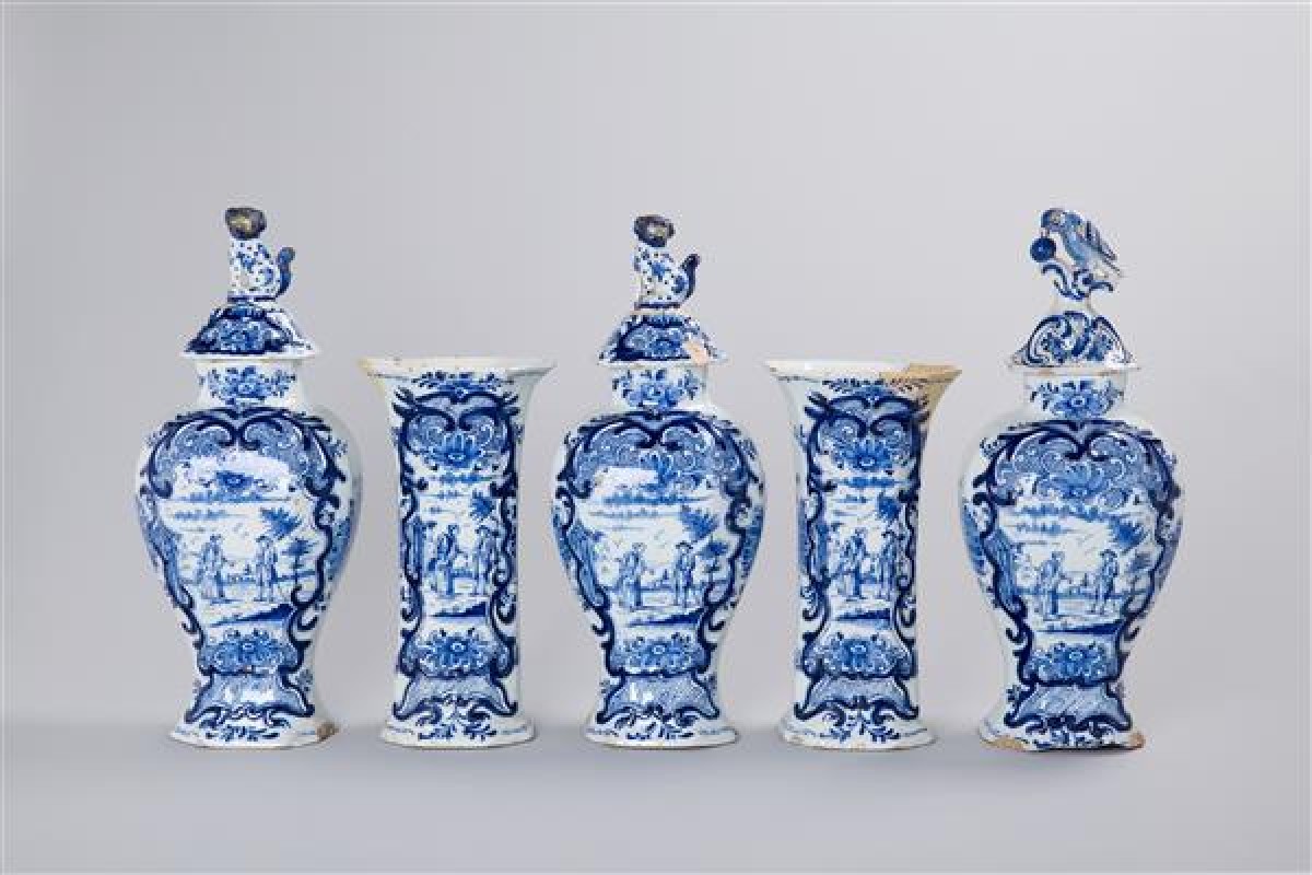Het vijfdelig, achtkantig uitgevoerde kaststel is samengesteld uit twee bekervazen en drie balustervormige potten, waarvan twee exemplaren zijn uitgerust met deksels die als knop een leeuw hebben. De voorzijden tonen een omlijsting in reliƫf van rococo voluten. Omringd door bloem- en bladwerk is binnen de omlijsten een landschappelijk tafereel weergegeven met een mans- en vrouwspersoon met aan de onderzijde het meandermotief.